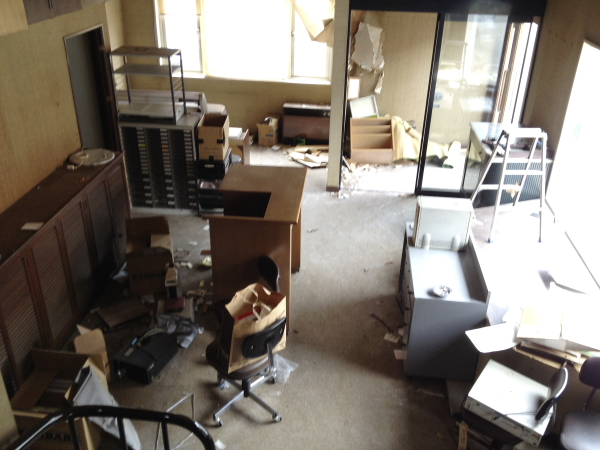 昨日始まった解体工事の現場にゴミが散乱する中、